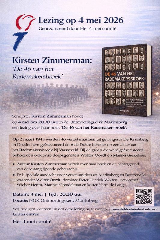 Schrijfster Kirsten Zimmerman houdt op 4 mei om 20.30 uur in de Ontmoetingskerk Mariënberg een lezing over haar boek ‘De 46 van het Rademakersbroek’